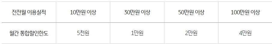 - 최초 사용등록일로부터 90일간은 실적에 관계없이 월간 할인한도 5,000원 제공하나 유예기간 중 전전월 실적조건 충족 시 해당구간 월간할인한도 적용됩니다.